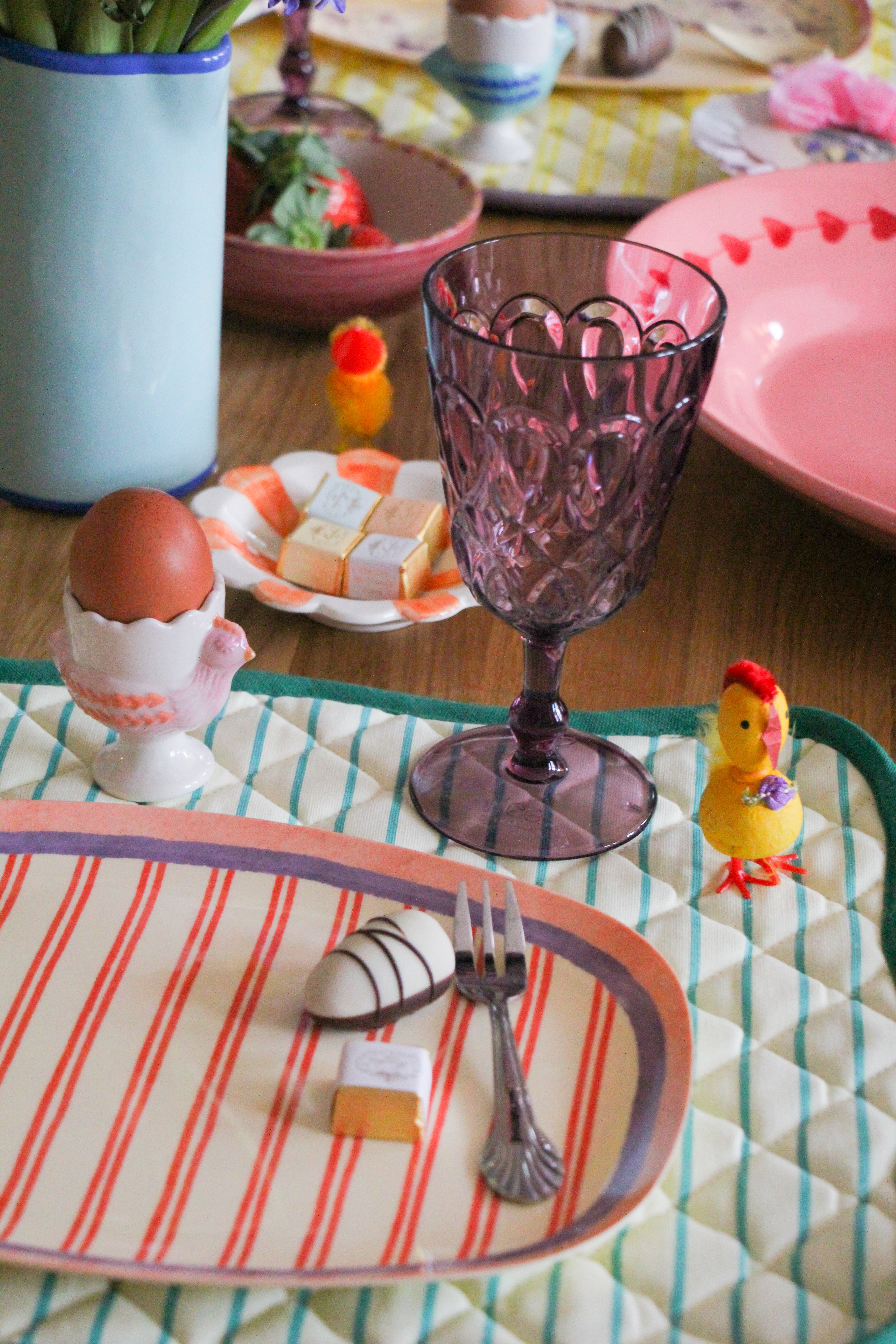 Når du dækker påskebord til påskefrokost, er det de små detaljer, der gør forskellen. Påskepynt som små fine chokoladeæg, æggebægre med høns og børnenes hjemmelavede påskepynt – de små gule kyllinger, man kender fra barndommen – er alt sammen med til at give bordet et personligt look. Sæt gerne friske blomster eller forårsgrene fra haven på bordet, for virkelig at mærke, at det endelig er forår.